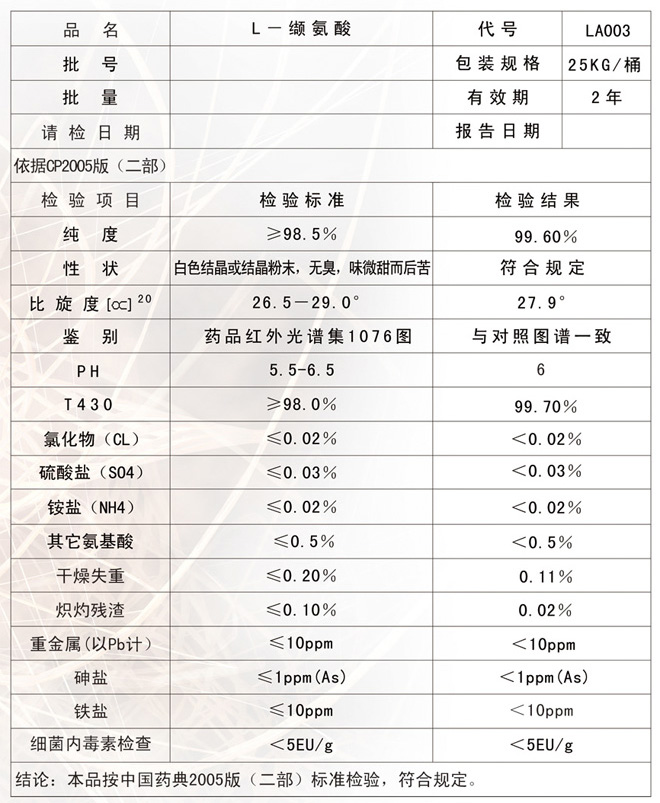 本品為白色結(jié)晶或結(jié)晶性粉末;用乙醇水溶液重結(jié)晶者為無(wú)色板狀或磷片狀結(jié)晶。無(wú)臭,有特殊苦味。熔點(diǎn)約315度。5%水溶液的PH值為5.5-6.5.對(duì)熱、光及空氣穩(wěn)定。易溶于水(8.85g/100ml,25度),幾乎不溶于乙醇和乙醚.與亮氨酸的分離困難。比旋度為+26.5°至+29.0°